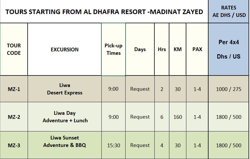 Al Dhafra Resort guests have the option to bookย multiple desert excursions with Rub Alkhali Desert Tours based on exclusivity.